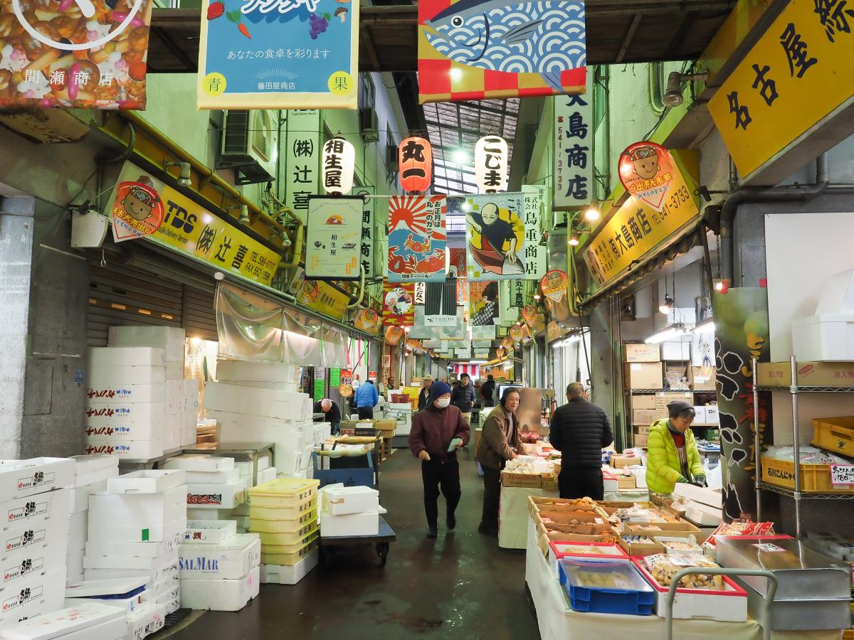 全国でも珍しく都心部一等地に構え、約100年もの歴史をもつ市場で早朝からにぎわいます。一般のお客さんも、市場ならではの新鮮な品物を買う事ができ、食事を楽しめます
